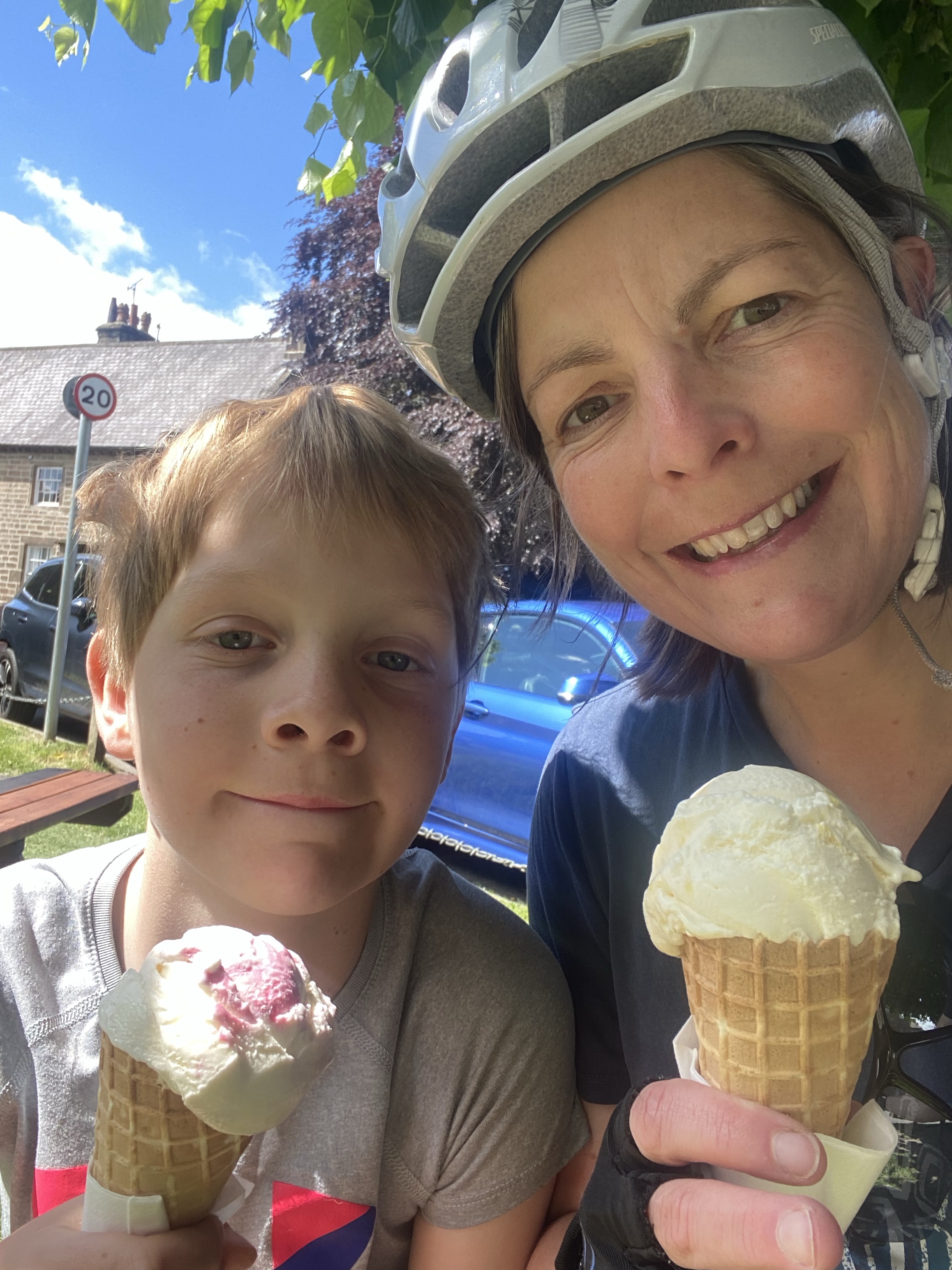 The sun was shining, the sky a deep, bright blue and I needed physical exertion. Benny agreed to come for a bike ride to Ripley and we rewarded ourselves with ice cream. Cherry swirl and lemon curd in crispy cones.